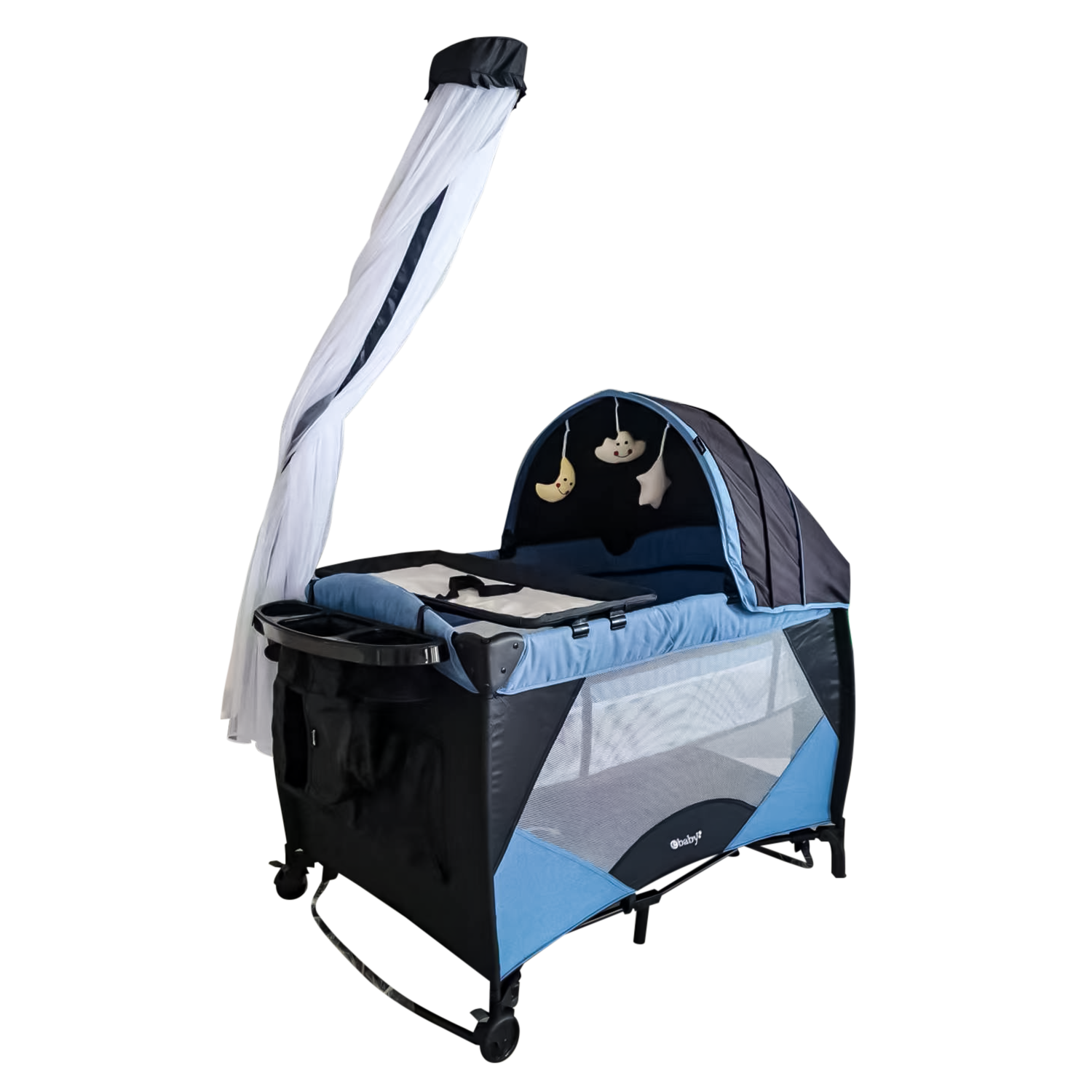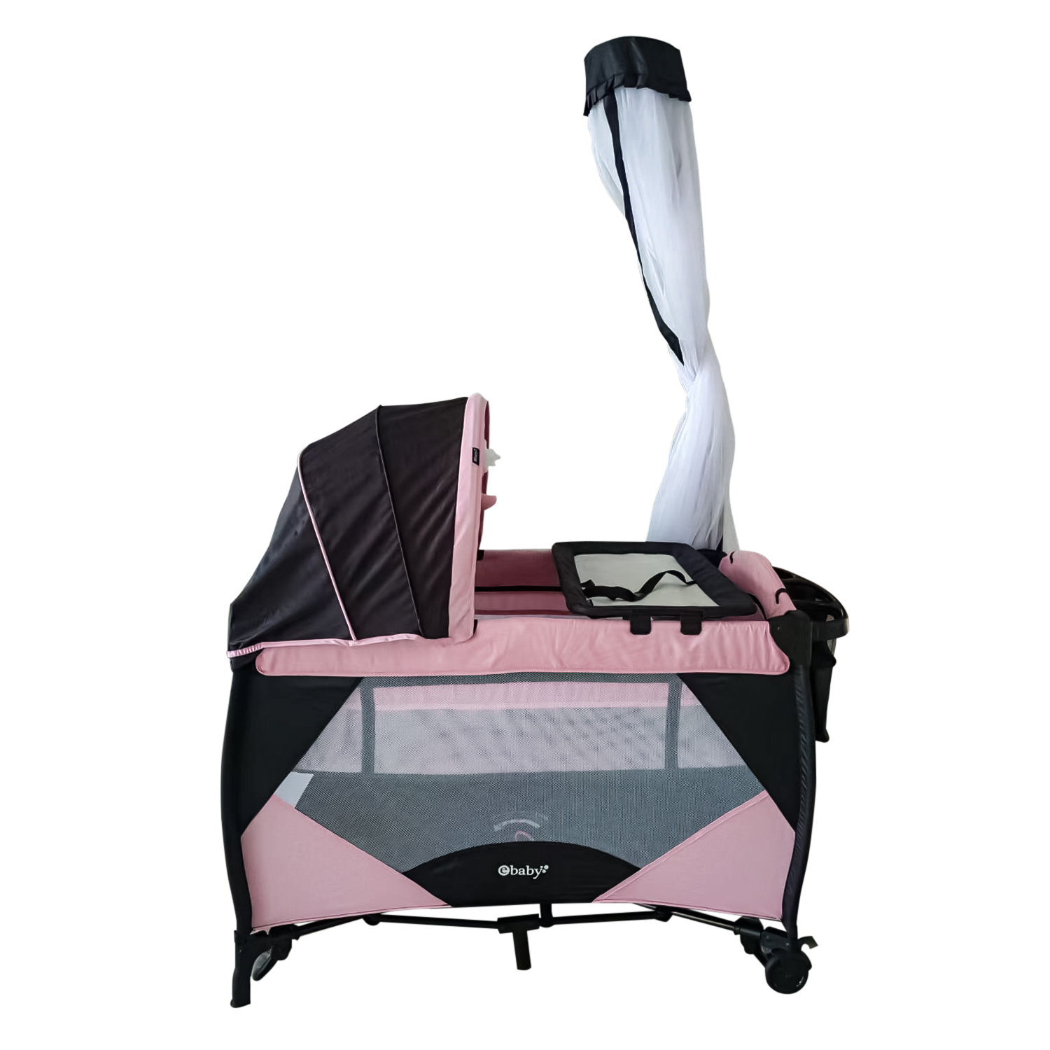 Cuna corral cuenta con tul antimosquitos y función mecedora. Ebaby trabaja siempre con elementos de la mejor calidad