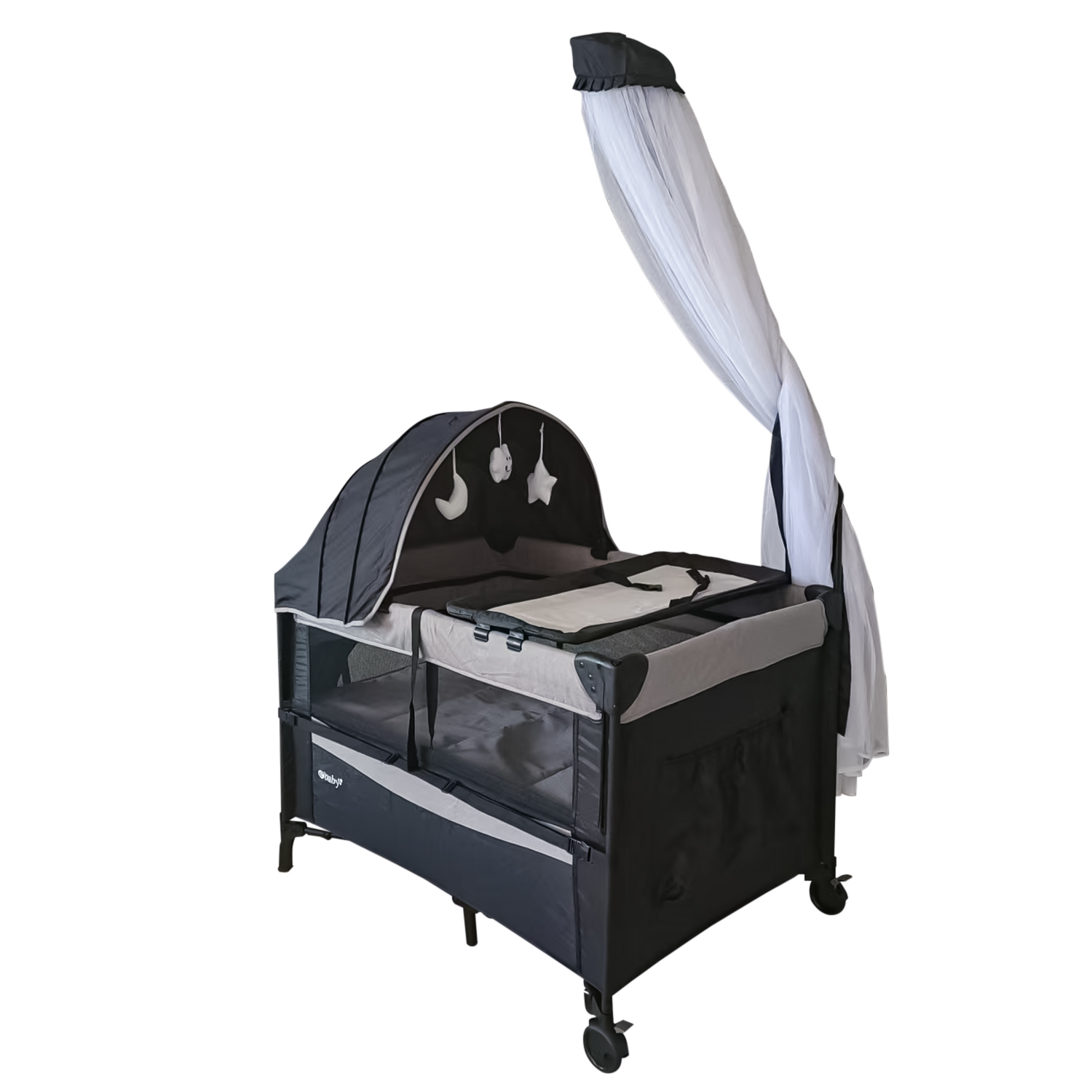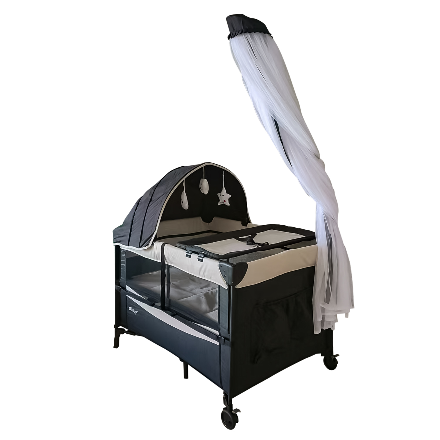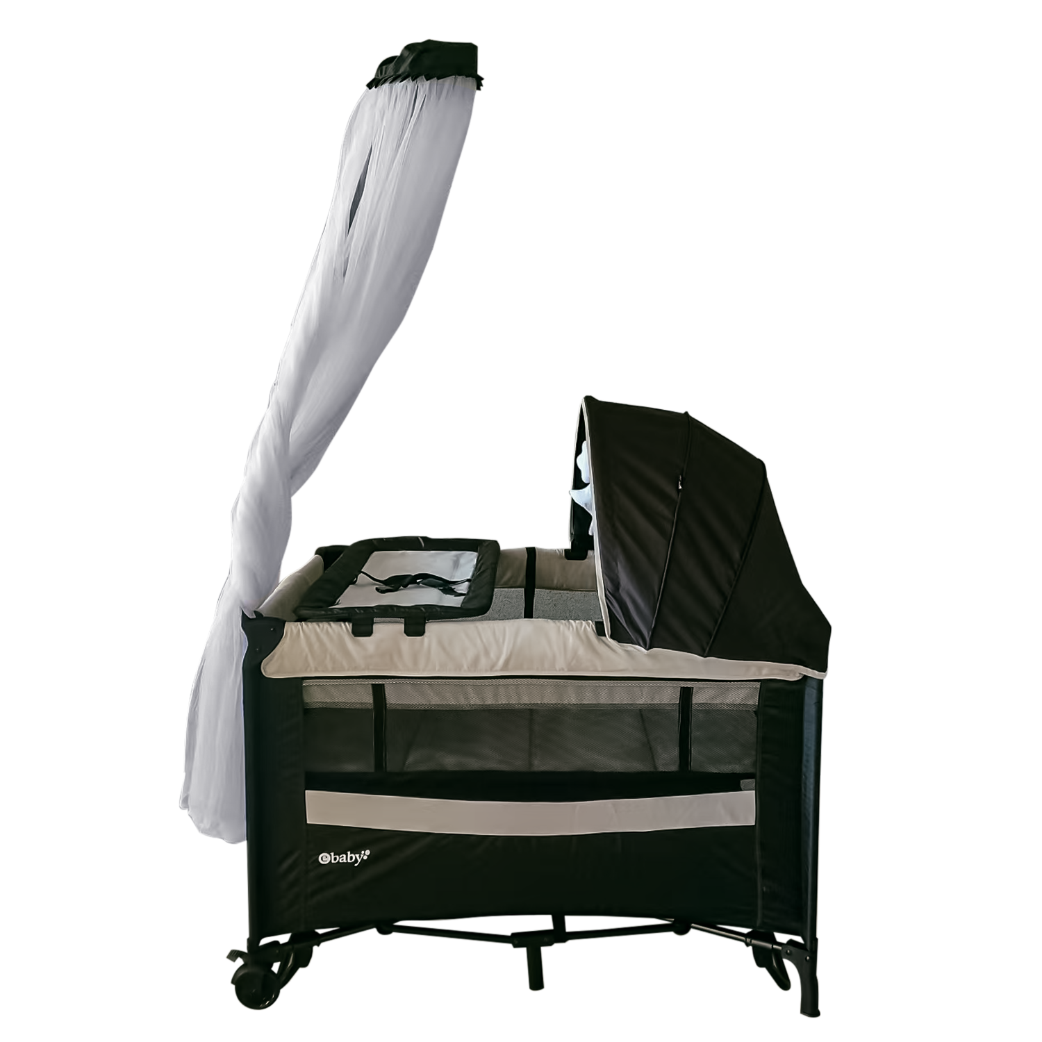 Cuna corral cuenta con tul antimosquitos y función mecedora. Ebaby trabaja siempre con elementos de la mejor calidad